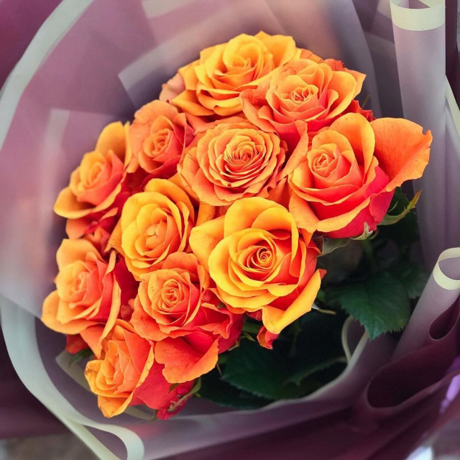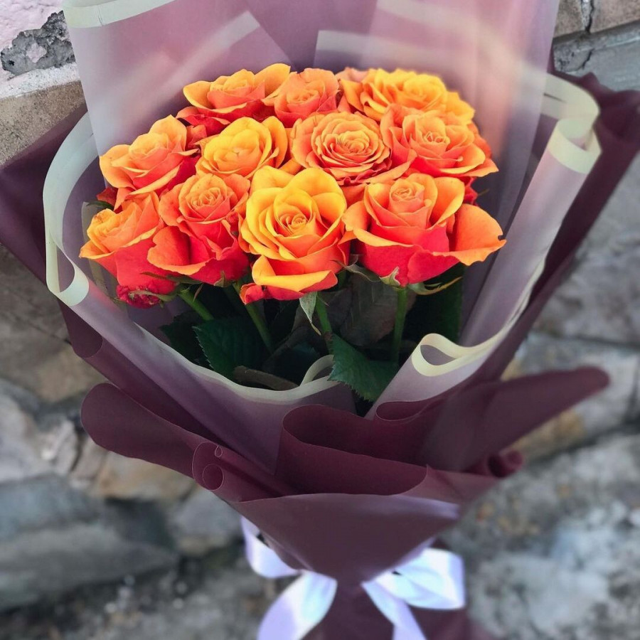 На фото букет из 11 оранжевых роз. В составе: роза 11 шт, крафт-бумага 1 шт, атласная лента 1 шт, . Все цветы свежие и ароматные, букет красиво оформлен и отлично подходит для подарка. Доступна доставка цветов или самовывоз.