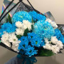 На фото букет из синих и белых хризантем. В составе: хризантема одноголовая 2 шт, хризантема кустовая 7 шт, крафт-бумага 1 шт, атласная лента 1 шт, . Все цветы свежие и ароматные, букет красиво оформлен и отлично подходит для подарка. Доступна доставка цветов или самовывоз.